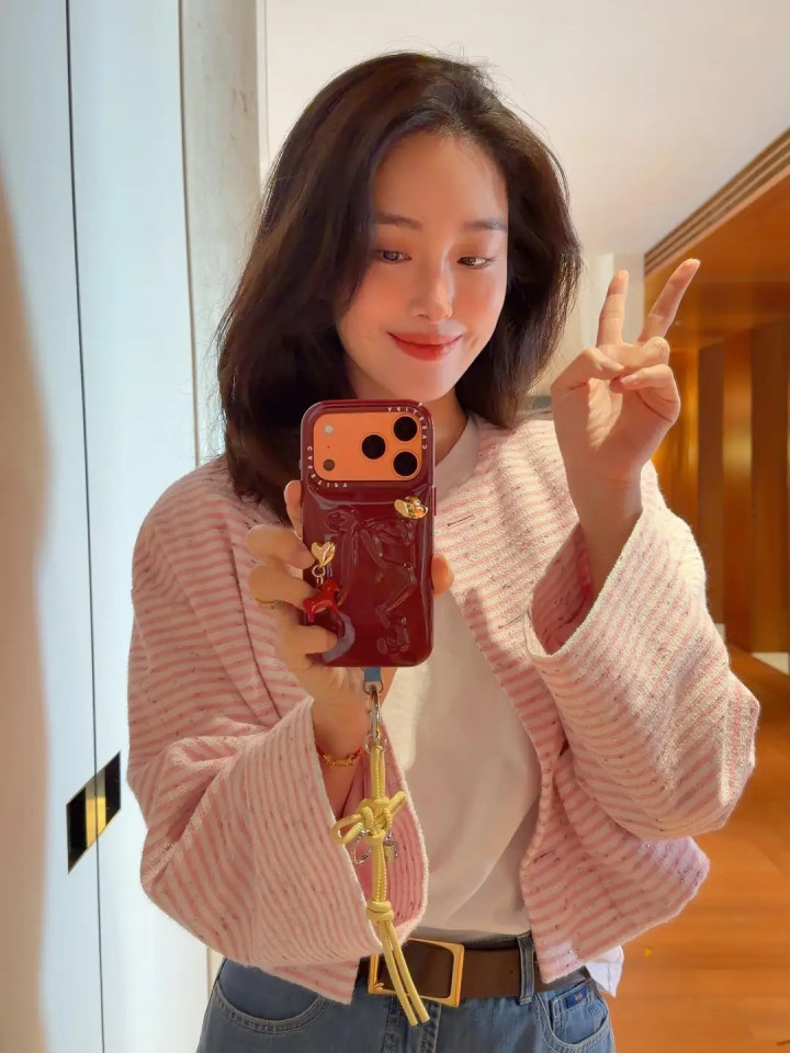 杨采钰穿着粉色条纹小外套,下搭配浅蓝色的高腰牛仔裤,化着淡妆。