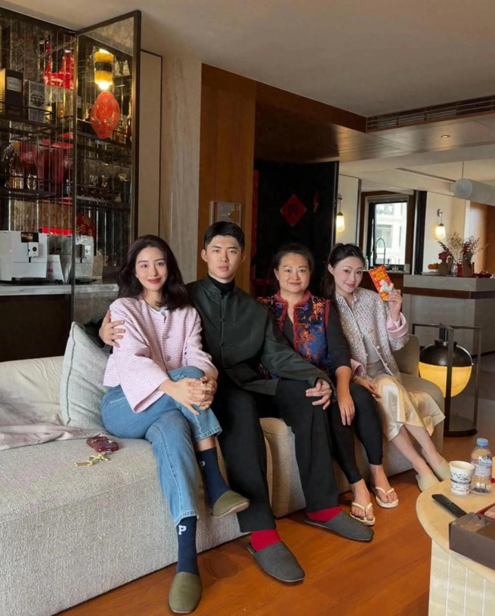 杨采钰还晒出合照,她与老公坐在一起,张向荣穿着黑色新中式套装,气质儒雅斯文。他一只手搂着老的肩膀,坐姿很端正。既有威严,又给人感觉很宠爱老婆。婆婆与小姑子挨着坐,她将头发盘起,很精神,穿着中式的国风上衣,圆脸很富态,目光有神。