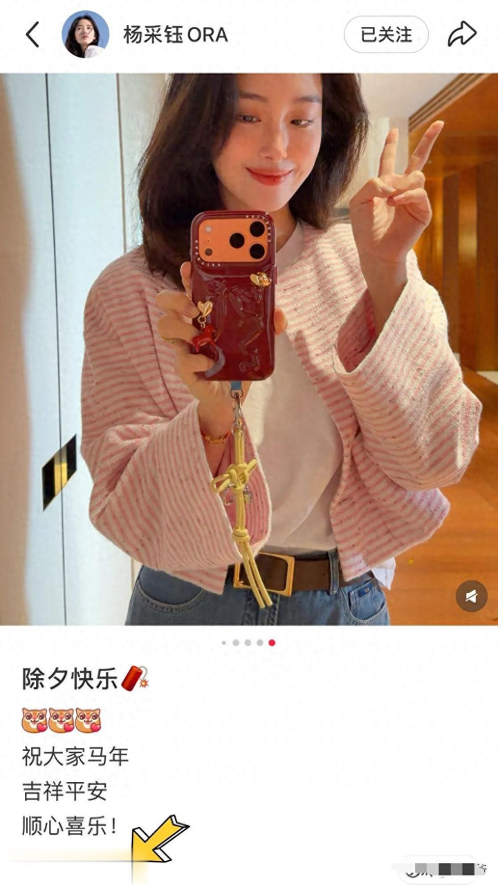 除夕夜杨采钰更新了动态,除了送上祝福,她还晒出自己的自拍照。产后不久的她恢复相当好,没有水肿。